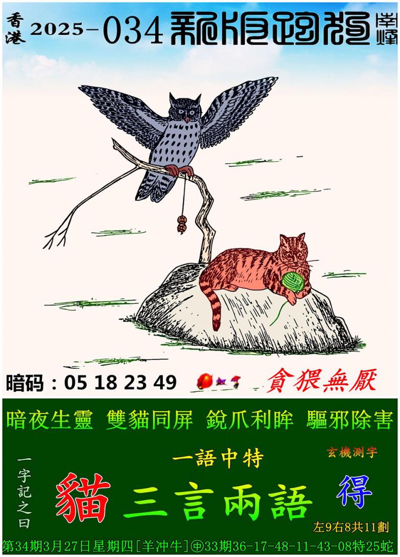 034期新版跑狗一字記之曰:【貓】 玄機測字:《得》 一語中特:三言兩語