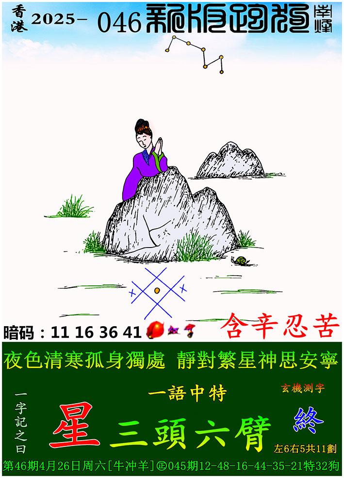 046期新版跑狗一字記之曰:【星】 玄機測字:《終》 一語中特:三頭六臂