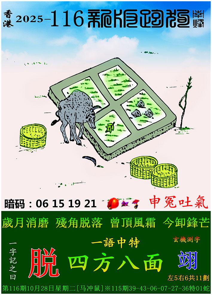 116期新版跑狗一字記之曰:【脫】 玄機測字:《翊》 一語中特:四方八面